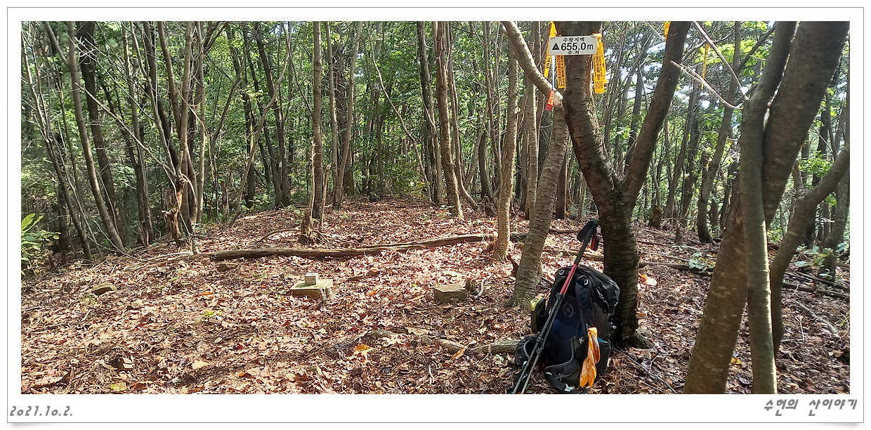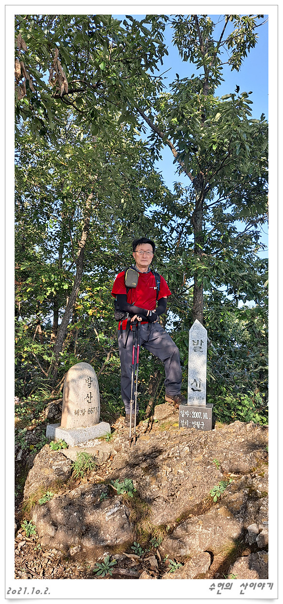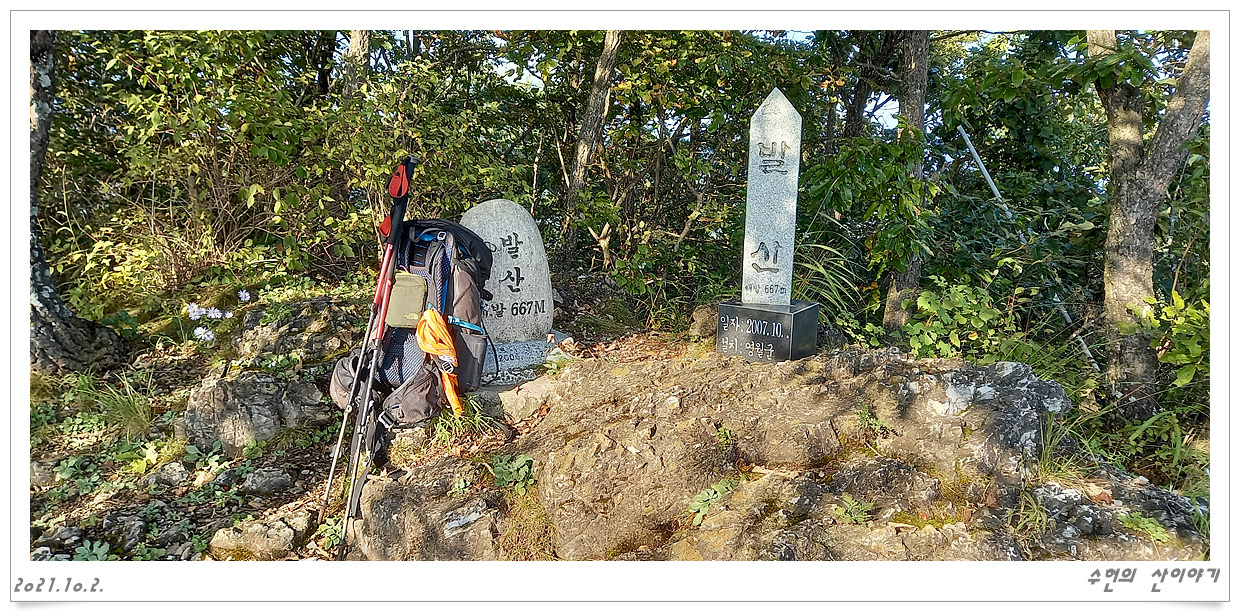 15:48~16:05 발산(676.1m) 정상/정상석 2개/조망 쉼터/급유 휴식(17분)후 출발