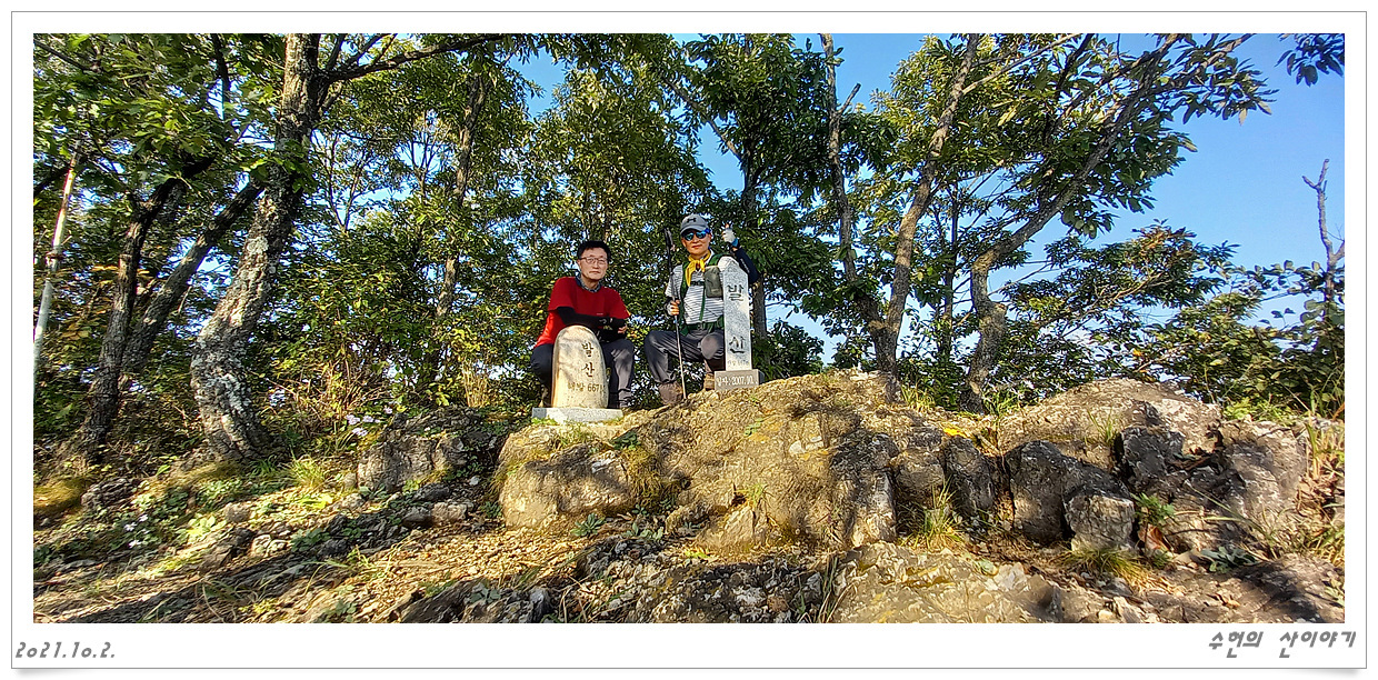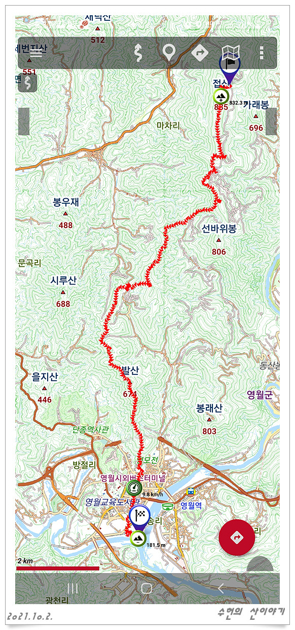 지형도상 발산을 지나 정상석 두개에 영월읍이 한눈에 내려다 보이는 발산 정상에 도착해서