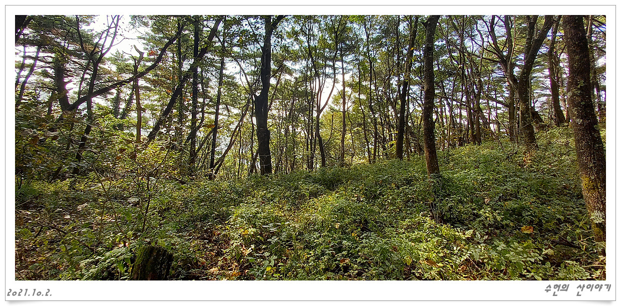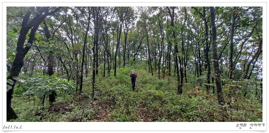 임도길 육각정자를 지나 마루금으로 올라서는 잡목밀림 지대,