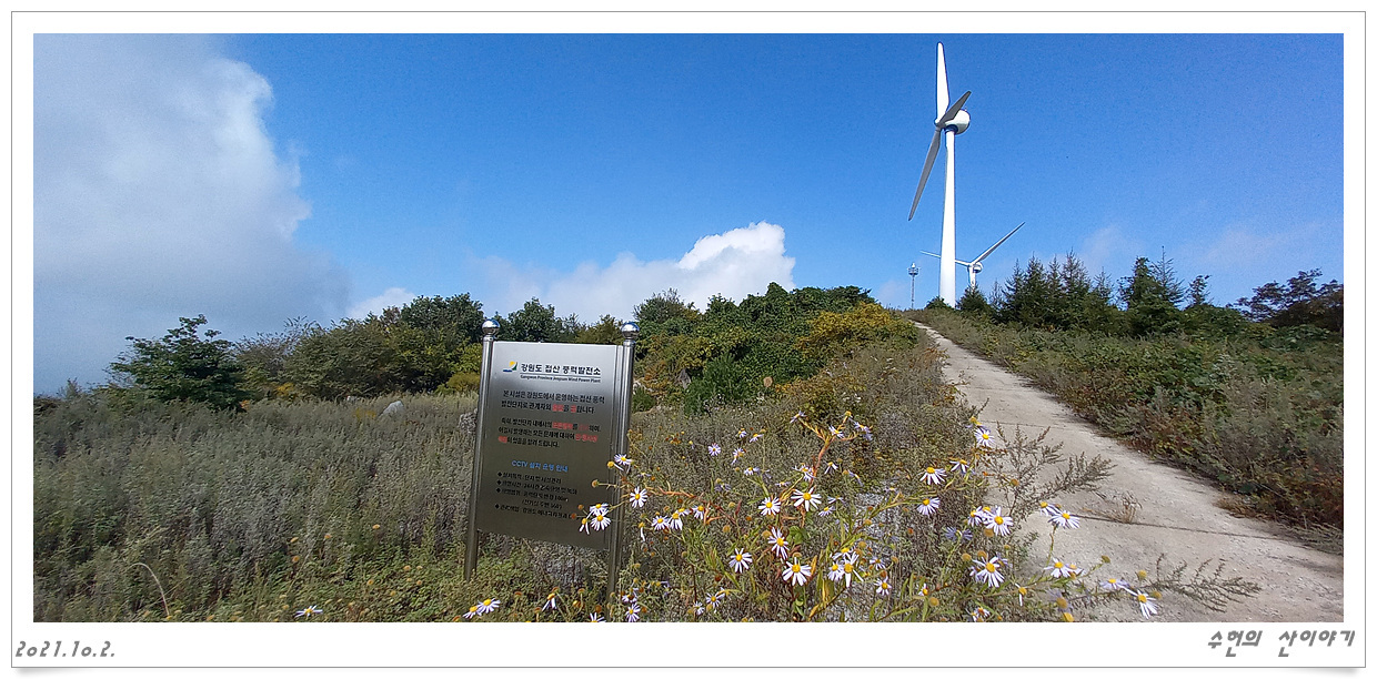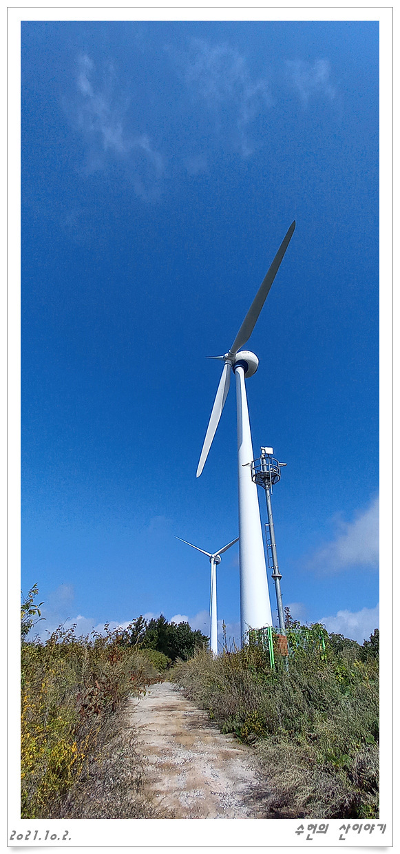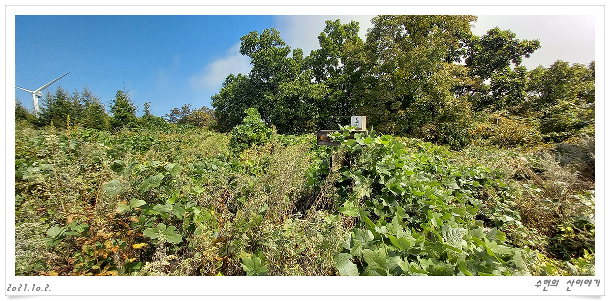 접산 정상은 오래된 정상목 기둥만 남은 특징없는 봉우리이고 곧이어 잡목을 잠시 헤치면 접산 풍력단지에 도착한다.